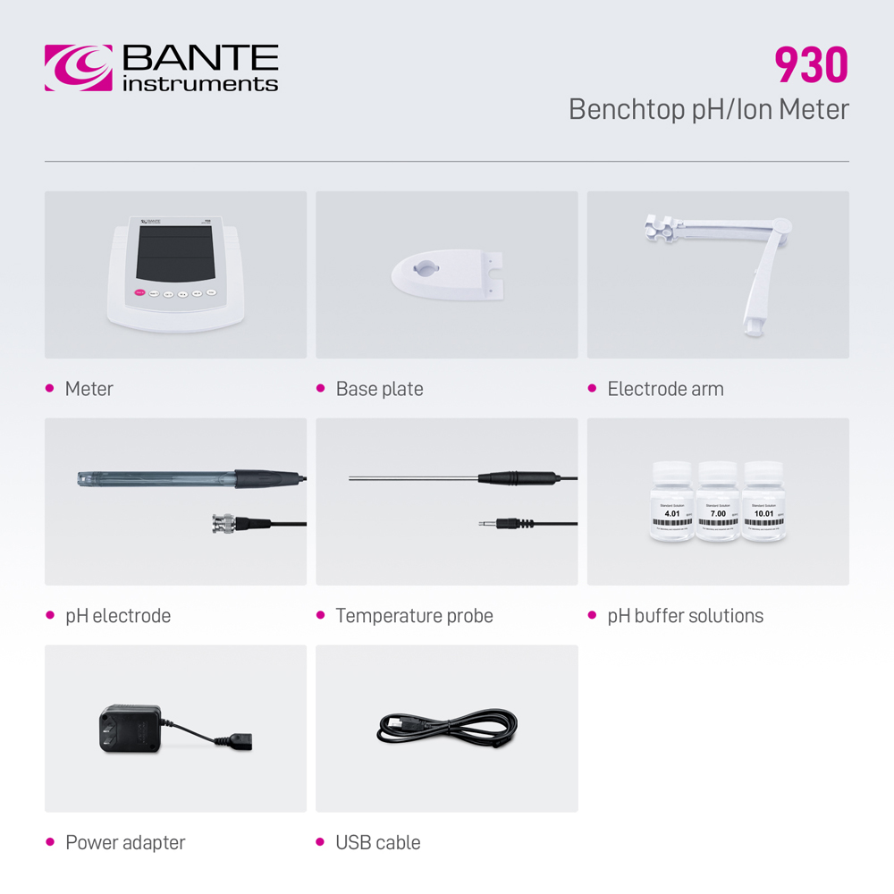 Professional benchtop pH/ion meter, 1 to 5 points calibration, selectable ion concentration units, setup menu contains 12 options, accuracy: 0.002 pH.